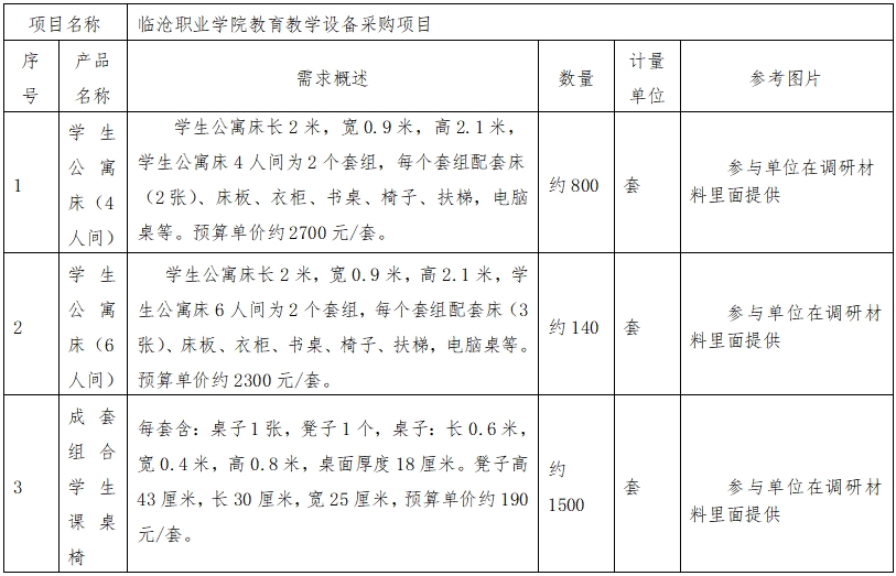 根据《中华人民共和国政府采购法》、《政府采购需求管理办法》等有关规定,beat365唯一官方网站拟对新采购学生公寓床、课桌椅等物资发布采购前期市场调研征集公告,欢迎具备资质、有意向的单位参与,并提供市场调研材料。