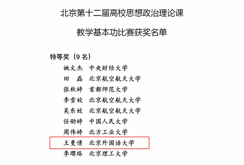 近日,北京市第十二届高校思想政治理论课教学基本功比赛结果揭晓,必赢国际437官网教师王曼倩获比赛特等奖。
