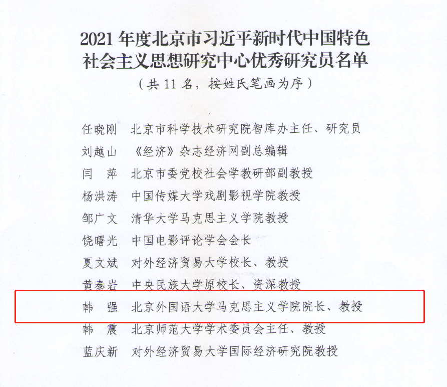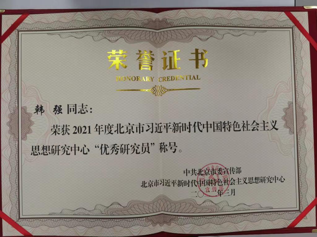 3月24日,北京市习近平新时代中国特色社会主义思想研究中心召开2021年工作总结暨2022年工作部署会,会议通报了2021年度北京市习近平新时代中国特色社会主义思想研究中心研究基地工作情况,并评选了2021年度北京市习近平新时代中国特色社会主义思想研究中心优秀研究员、优秀工作者和优秀研究基地,必赢官网韩强教授获评2021年度北京市习近平新时代中国特色社会主义思想研究中心优秀研究员。