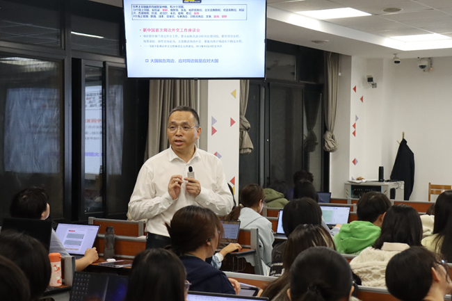 10月30日,必赢国际437官网校长、党委副书记杨丹以《中国特色大国外交理论解读》为题,分别为2022级西班牙语葡萄牙语学院、英语学院本科生讲授“形势与政策”课程。