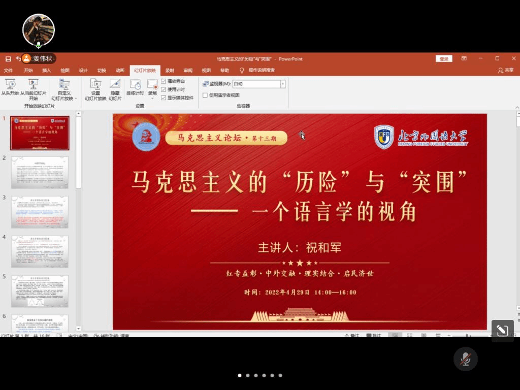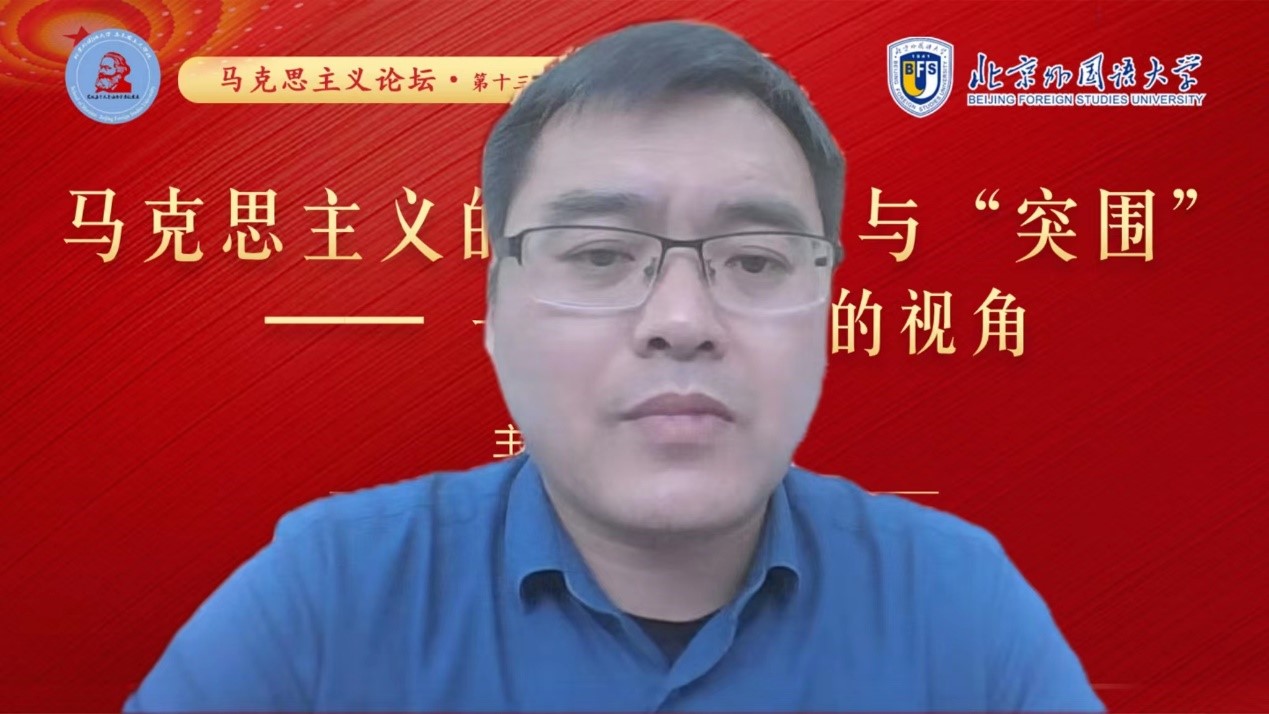 4月29日下午,北外马院马克思主义论坛第十三期顺利开讲。必赢国际437官网党总支书记祝和军以“马克思主义的‘历险’与‘突围’——一个语言学的视角”为题做了专题讲座。本次活动由2020级硕士研究生姜伟秋主持,共有包括北外马院师生在内的近百余人参会。