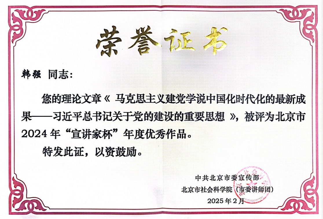 近日,中共北京市委宣传部、北京市社会科学院(市委讲师团)公布了2024年度“宣讲家杯”优秀报告(党课))获奖作品名单,必赢官网韩强教授的理论文章《马克思主义建党学说中国化时代化的最新成果——习近平总书记关于党的建设的重要思想》入选2024年度“宣讲家杯”优秀作品。
