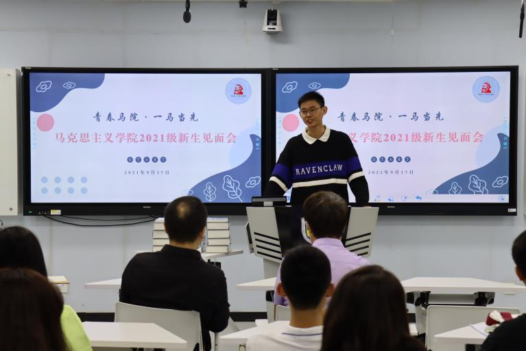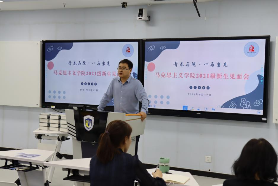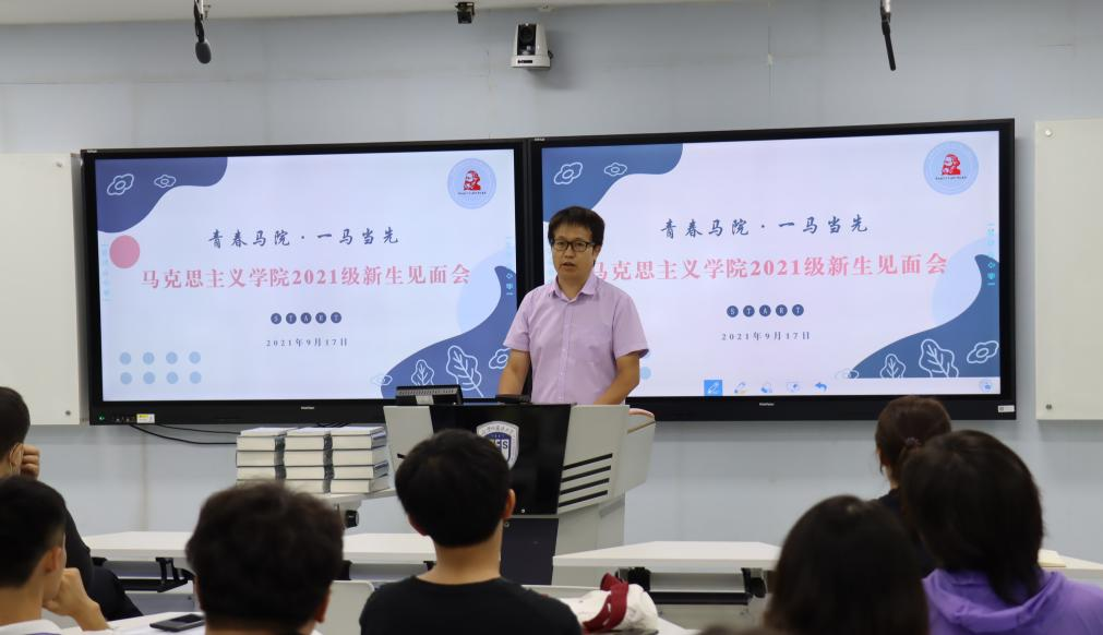 党总支书记祝和军老师致辞欢迎新生加入马院大家庭,他向新生介绍了马院发展历史,以及国家、学校对马院和马克思主义理论学科的高度重视。他谈到,马院正在重大发展机遇下不可逆转地进入发展快车道,为促进学院发展,今年必赢官网引进了韩强、左高山两位教授,相信他们的加入会使马院越来越好。随后他表示,马院的发展离不开每一位同学的努力,他号召同学们为壮大马院贡献力量,并从两个方面为新生提出建议:一是要树立底线思维,把握好学生身份,把学习作为主责主业;二是要避免系统性风险,注重人身安全、财产安全和政治安全。