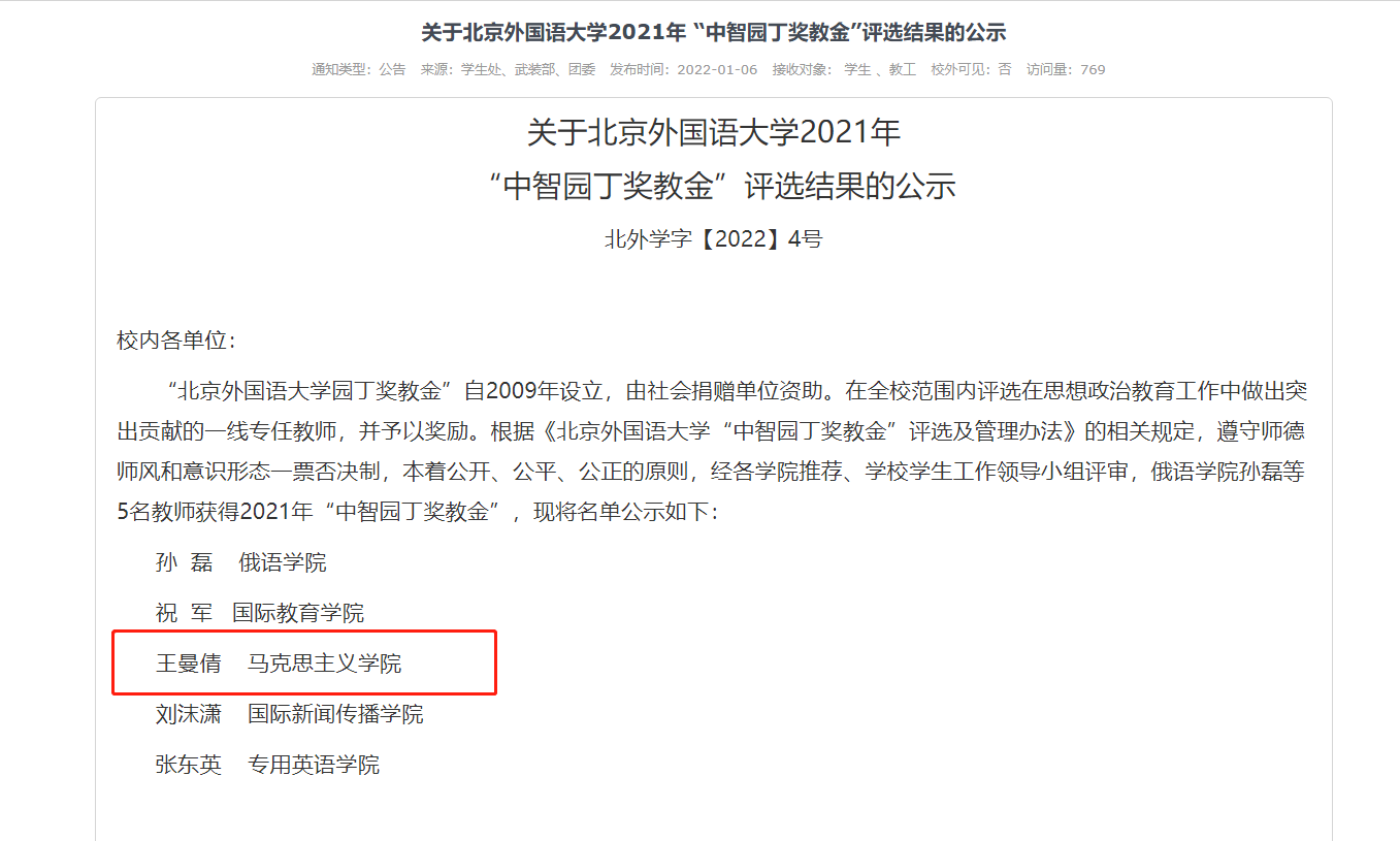根据《必赢国际437官网“中智园丁奖教金”评选及管理办法》相关规定,遵守师德师风和意识形态一票否决制,本着公开、公平、公正的原则,经各学院推荐、学校学生工作领导小组评审,共有包括必赢官网王曼倩副教授在内的5名教师获得2021年“中智园丁奖教金”。