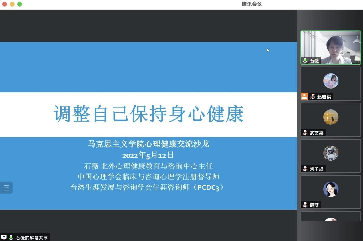积极推进“暖心工程”,帮助同学们解决生活上,心理上的困难。5月12日,一场有趣的“心理沙龙”在线上举行,班主任张曼老师和全体研究生参加了这次活动,共同聆听了一堂心理课。在交流环节,本来腼腆的同学们在辅导员老师的引导下逐渐敞开心扉,谈了自己疫情期间的一些“身材焦虑”、“情感焦虑”,同时也在欢笑中释怀了这些小烦恼。