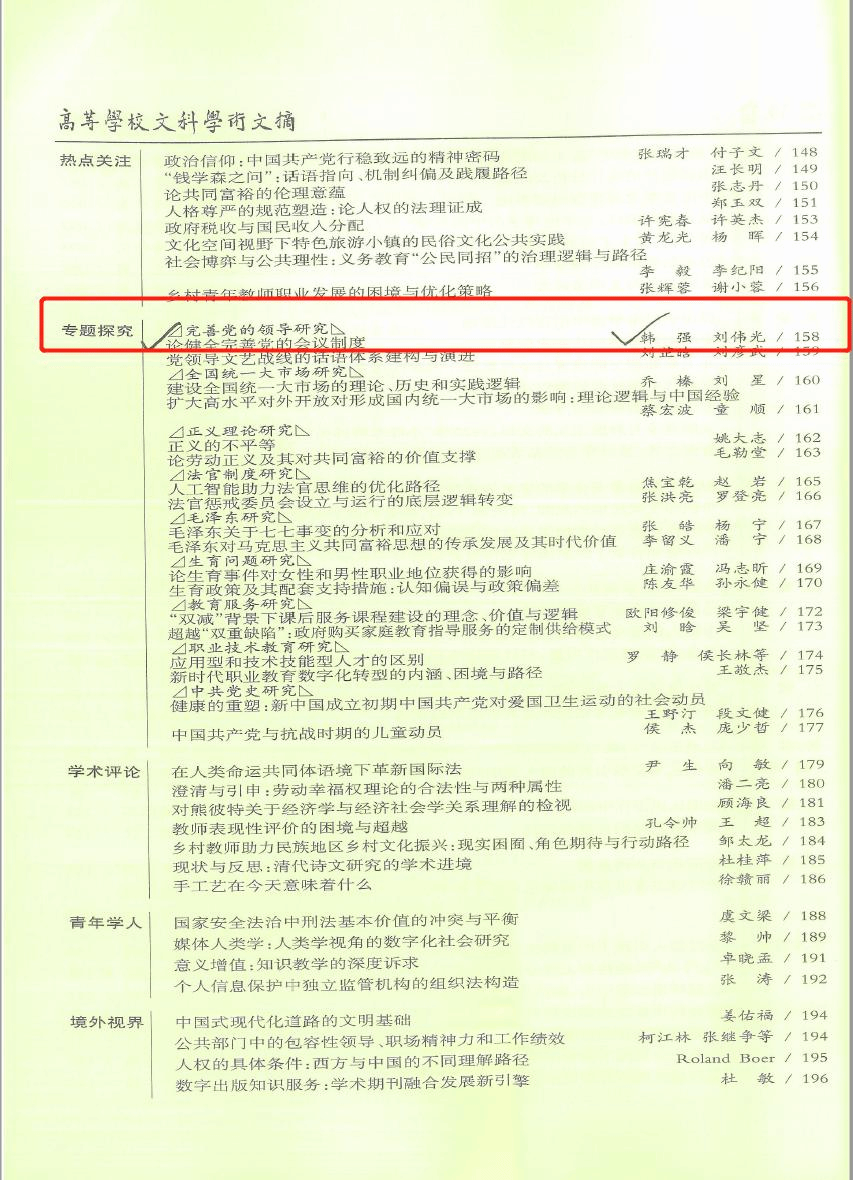 近日,必赢官网韩强教授文章《论健全完善党的会议制度》被《高等学校文科学术文摘》(2022年第6期)全文转载,文章原文发表于《探索》(2022年第5期)。