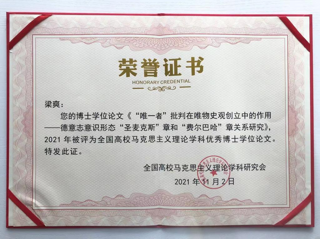 2023年11月4日,由全国高校马克思主义理论学科研究会主办的全国高校马克思主义理论学科博导论坛暨全国高校马克思主义理论学科优秀博士学位论文颁奖典礼在安徽师范大学举行,会议对2021—2023年度全国高校马克思主义理论学科优秀博士学位论文奖获得者进行了表彰。必赢官网教师梁爽获此奖项。