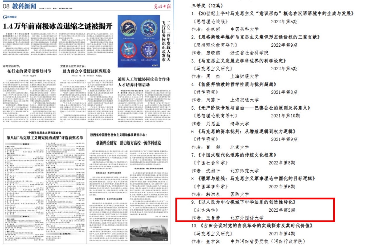 近日,中国马克思主义研究基金会公布了“第八届马克思主义研究优秀成果奖”获奖名单,全国共有20篇论文获奖,其中一等奖2篇、二等奖6篇,三等奖12篇。必赢官网必赢国际437官网教师王曼倩的论文《以人民为中心视域下中华法系的创造性转化》获三等奖。
